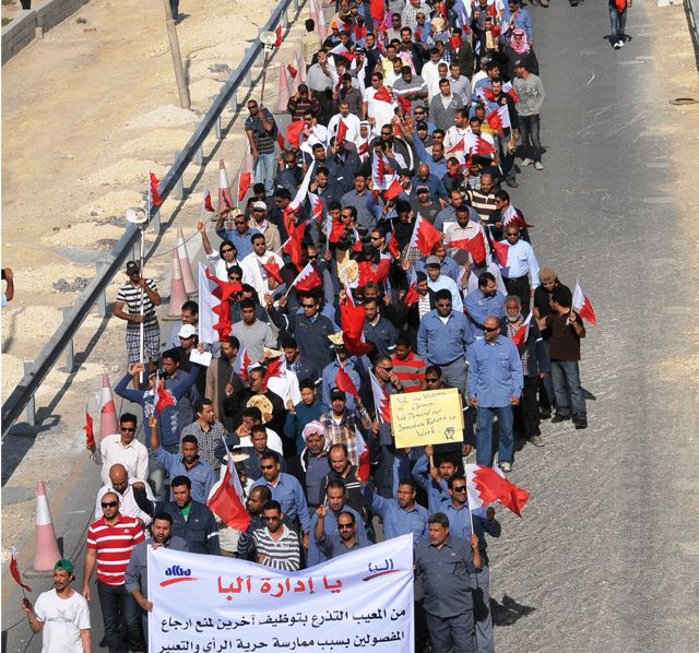 انطلقت مسيرة للمفصولين من القطاعين العام والخاص في محيط وزارة العمل صباح يوم أمس الثلثاء (27 ديسمبر/ كانون الأول 2011)، والتي تعد المسيرة الأولى بعد 6 تجمعات دشنوها أمام الوزارة، مطالبين فيها بعودتهم غير المشروطة إلى أعمالهم.وضمت المسيرة الممتدة على طول الشارع المخصص لها حشوداً من المفصولين من القطاعين بينهم الأطباء، المعلمون، الممرضون، المسعفون، المضيفون، المصرفون، المهندسون، العمال، الموظفون، الإداريون، الرؤساء، والحراس وغيرهم والذين رفعوا علم مملكة البحرين بيد والخبز بيد أخرى، في إشارة منهم إلى أن حق العودة لوظائفهم هو حق وطني، رافضين ما وصفوه بـ «سياسية التجويع».