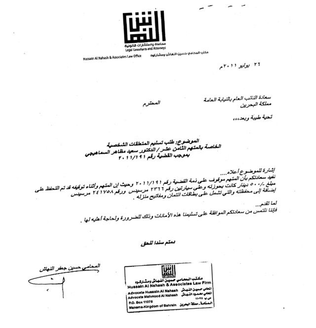 وذكر النهاش «خاطبنا النائب العام بالنيابة العامة في شهر يوليو/ تموز الماضي (2011)، ولم يأتنا أي رد منهم، كما خاطبنا المحكمة أيضاً، ولم نحصل على رد منهم»، مشيراً إلى أنه «تم التحفظ على مبلغ 500 دينار كانت بحوزة السماهيجي، وعلى سيارتي مرسيدس إحداهما تحمل رقم (2366)، والأخرى (241758)، إضافة إلى محفظته التي تشتمل على بطاقات ائتمان ومفاتيح منزله.